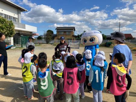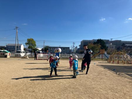 まる・カマきっずにはコーチ3名に加えさぬぴーも訪問し、城辰保育所の子どもたち約50名と城南保育所の子どもたち約40名と青空の下ボールを追いかけました。