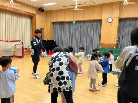 ウォーミングアップをしたあと、子どもたちとボールを使ってお遊戯室を駆け回りました。