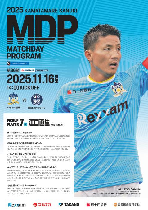 11月16日(日) 14:00KICKOFF 株式会社石垣presents2025明治安田J3リーグ第36節鹿児島ユナイテッドFC 戦 かがわスポーツ×ファンキッズDAY/さぬき市サンクスDAY のマッチデープログラムを公開!!