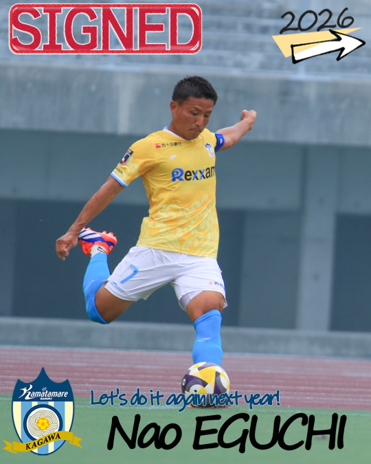 来シーズンもこのクラブで戦えることに感謝し、カマタマーレ讃岐のために全力を尽くします。2025シーズンの悔しさを忘れることなく、日々自分と向き合い、精進してまいります。