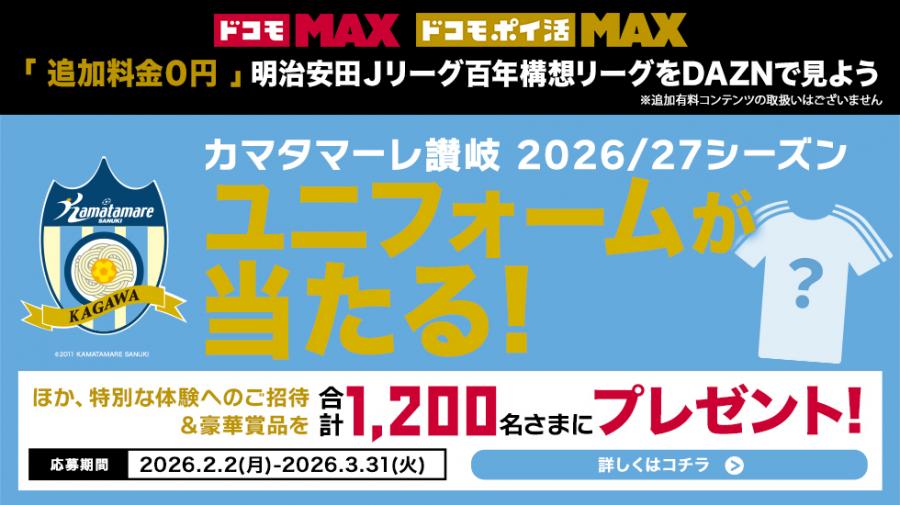 カマタマーレ讃岐は、株式会社NTTドコモとの協業により、「ドコモ MAX」「ドコモ ポイ活 MAX」ご契約者様 を対象としたキャンペーンを、以下の通り実施しますのでお知らせします。