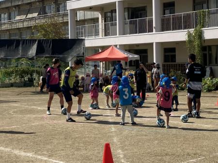 最後のミニゲームでは選手3名&園長先生の連合チームvs子どもチームで試合。晴れやかな空の下とても賑やかな空気に包まれていました。