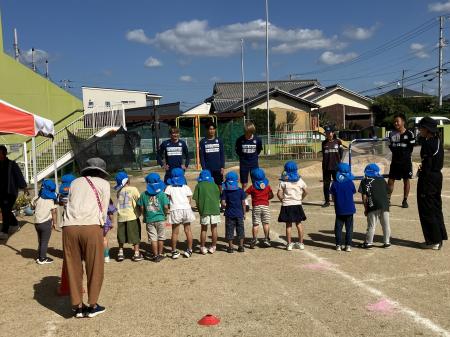 10月9日(木)に、丸亀市立城辰幼稚園に川西翔太選手・柳雄太郎選手・石倉潤征選手とスクールコーチが訪問しましたのでご報告いたします。