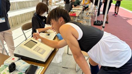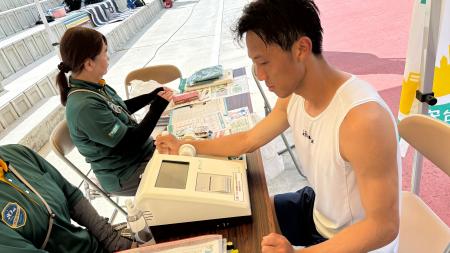 ホームゲームでもおなじみのベジチェックと、骨健康測定が行われました。