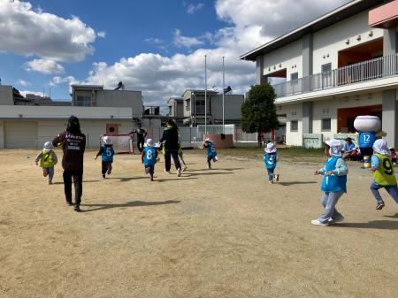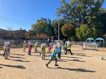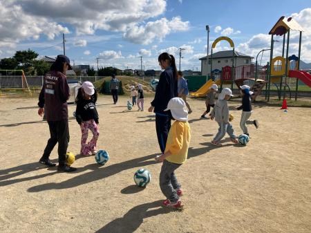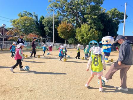 まる・カマきっずにはコーチ3名に加えさぬぴーも訪問し、城辰保育所の子どもたち約50名と城南保育所の子どもたち約40名と青空の下ボールを追いかけました。