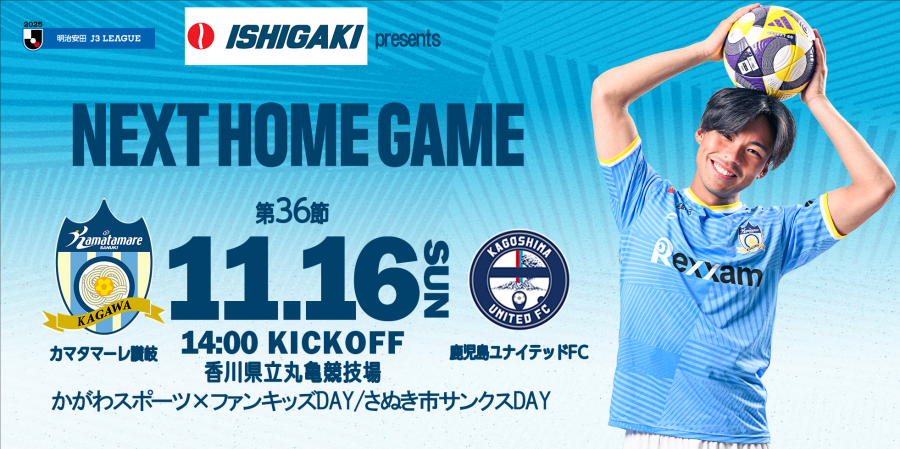 11月16日(日) 14:00KICKOFF 株式会社石垣presents2025明治安田J3リーグ第36節鹿児島ユナイテッドFC 戦 かがわスポーツ×ファンキッズDAY/さぬき市サンクスDAY のイベント情報をお知らせいたします。