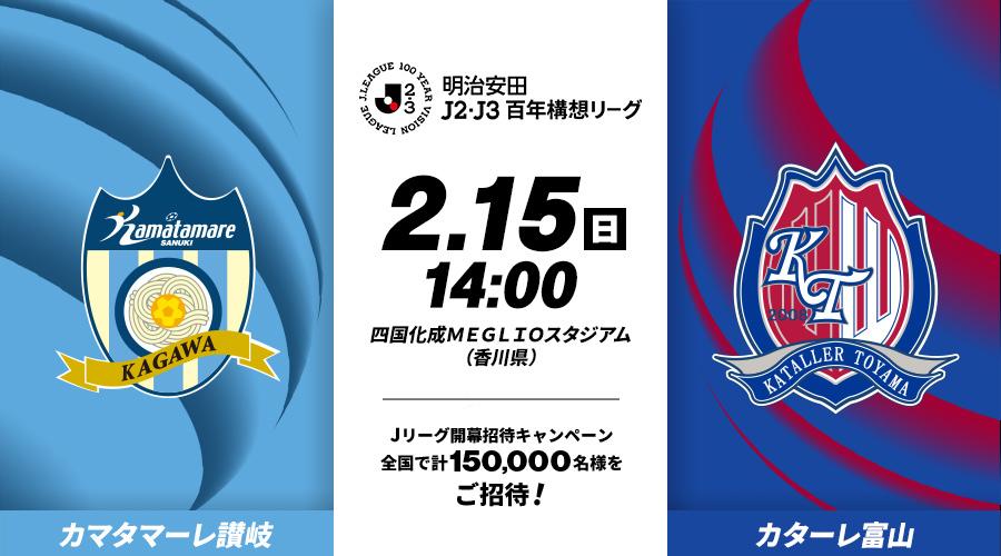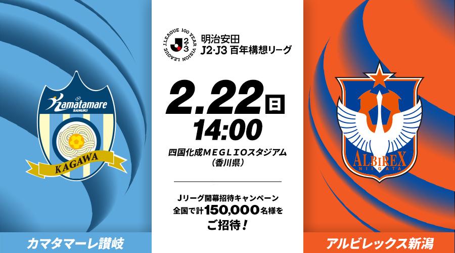 カマタマーレ讃岐では、2/15(日) 明治安田J2・J3百年構想リーグ第2節戦カターレ富山戦、2/22(日)明治安田J2・J3百年構想リーグ第3節アルビレックス新潟戦にて、「開幕招待キャンペーン」を実施いたしますので、下記の通りお知らせいたします。2試合で合計1,250組2,500名様をご招待いたします。ぜひこの機会に試合にお越しください。たくさんのお申込みをお待ちしております!