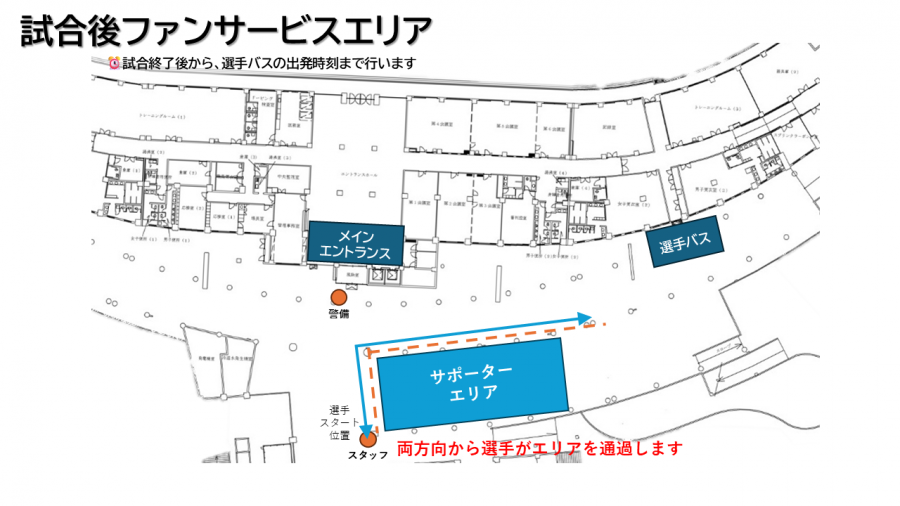 ・選手バスの出発後にスタジアムを出る選手はファンサービスの対応をしかねますのでご了承ください。