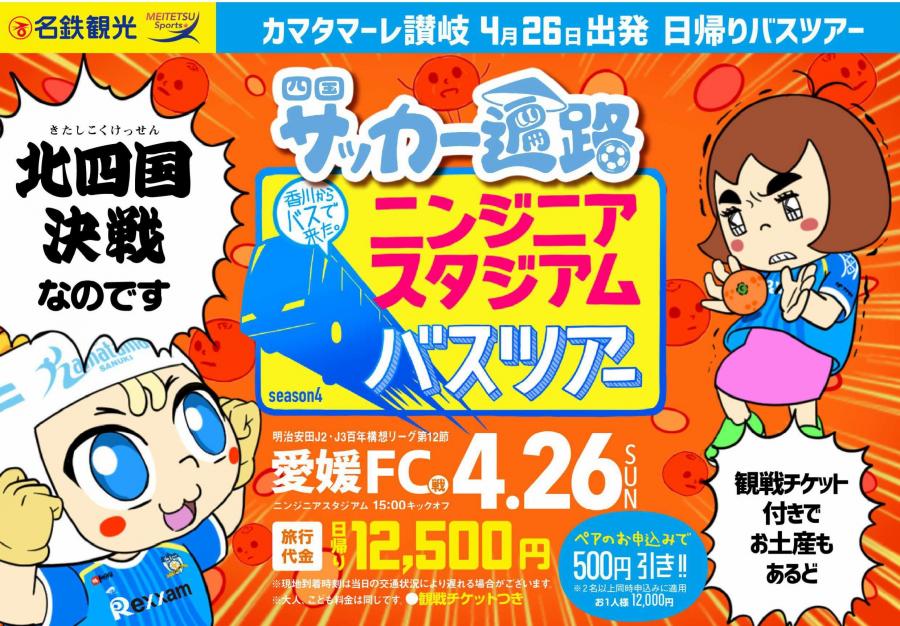 このたび、4月26日(日)愛媛FC戦にて、オフィシャルスポンサー「名鉄観光サービス」さまによるアウェイ応援バスツアーが開催されることになりましたので、参加者を募集します。