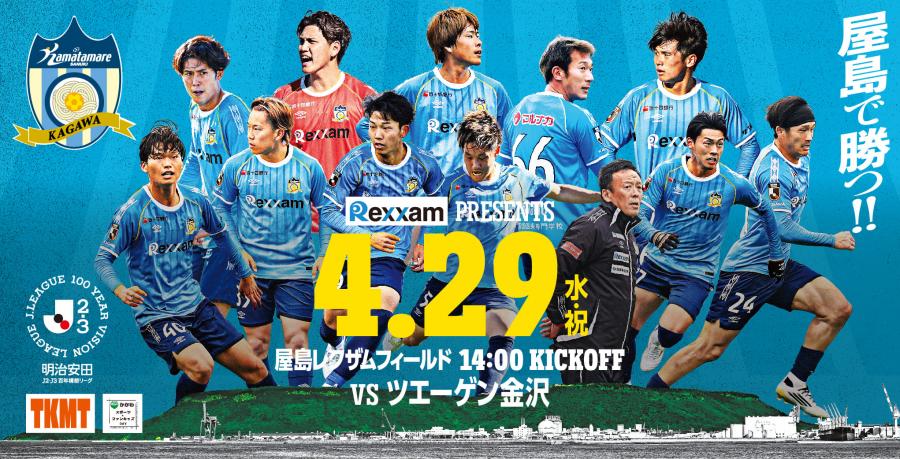 4月29日(水・祝) 14:00KICKOFF レクザムpresents 明治安田J2・J3百年構想リーグ第13節 ツエーゲン金沢戦 かがわスポーツ×ファンキッズDAY・高松市ホームタウンDAY~ 高松市・金沢市 都市提携記念 ~Yにおいて、今年も高松市屋島地区でのにぎわいを創出する目的の企画を実施します。