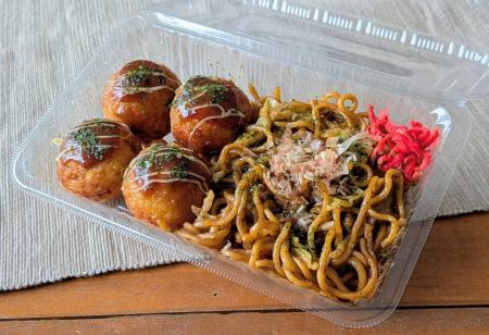 ソバたこハーフ(600円): ふっくら仕上げた大粒たこ焼きと、3種のソースで仕上げた旨みたっぷりの焼きそばの黄金コンビ!!